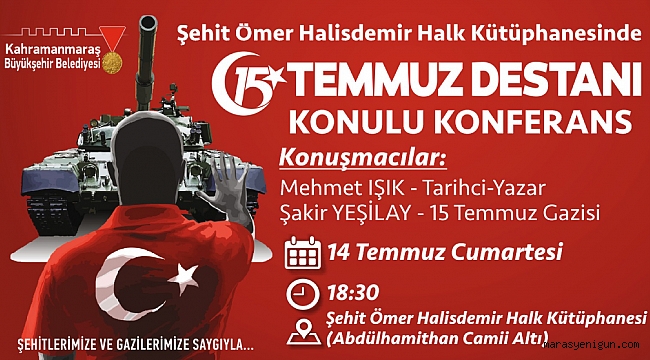 Kahramanmaraş Büyükşehir Belediyesi bünyesinde hizmet veren Şehit Ömer Halisdemir Halk Kütüphanesi’nde 15 Temmuz Destanı konulu bir konferans gerçekleştirilecek.
