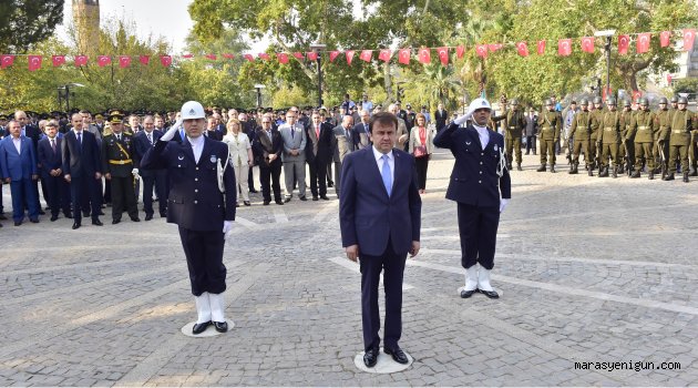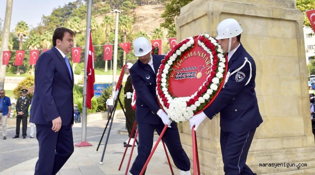 \r\n\r\nValilik Makamı çelengini Kahramanmaraş Valisi Vahdettin Özkan, Garnizon Komutanlığı çelengini Garnizon Komutan Vekili Albay Bayram Ölçücüoğlu, Büyükşehir Belediye Başkanlığı çelengini Büyükşehir Belediye Başkanı Fatih Mehmet Erkoç, Atatürk Anıtı’na sundular.