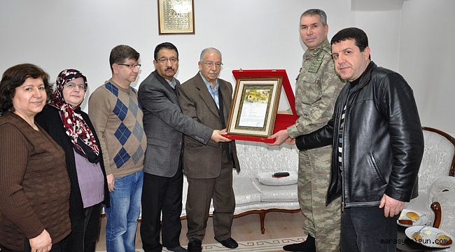 Eşkıyaların Hakkari'de 74 yıl önce şehit ettiği askerin Kahramanmaraş'ın Elbistan ilçesindeki ailesine şehadet belgesini, İl Jandarma Alay Komutanı Albay Timuçin Alper verdi