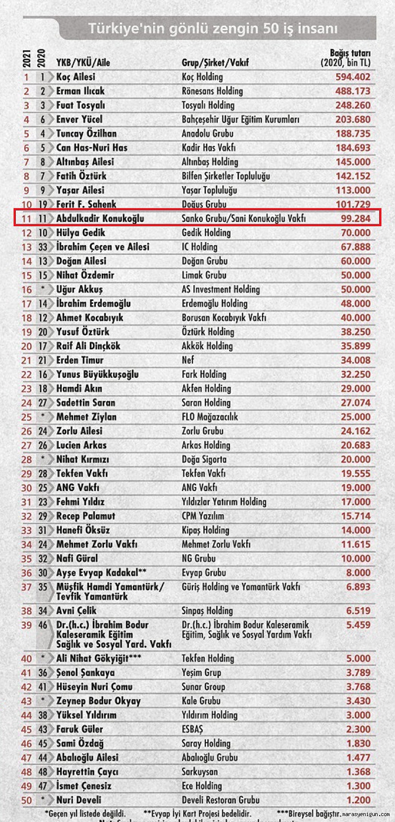 Capital dergisinde “Yaralar İyilikle Sarılıyor” başlığı ile yayımlanan haberde, 2020 yılının pandemiyle başladığı, İzmir depremi gibi büyük bir yıkımla devam ettiği belirtilerek, “Bu zor yılda hayırsever iş insanlarına gelen yardım talepleri de önemli ölçüde arttı. Bu durum, Capital’in bu yıl dokuzuncusunu gerçekleştirdiği ‘Türkiye’nin Gönlü Zengin 50 İş İnsanı’ araştırmasına da yansıdı” denildi.Özlem Aydın Ayvacı’nın hazırladığı haberde, Sani Konukoğlu Vakfı Mütevelli Heyet Başkanı Abdulkadir Konukoğlu’nun, Türkiye’de hayırseverlik dendiğinde akla gelen ilk isimlerden biri olduğuna dikkat çekilerek, şunlar kaydedildi:“Konukoğlu Ailesi’nin tüm Türkiye’ye rol model olduğu hayırseverlik, ailede kuruluşa kadar uzanan köklü bir gelenek. Konukoğlu da bu özelliğiyle her yıl binlerce yardım talebi alıyor. Konukoğlu, vakıf senedine uygun olarak eğitim ve sağlık alanlarında yoğunlaştıklarını belirtiyor.”SANKO Grubu ve Sani Konukoğlu Vakfı’nın 2020 yılındaki bağış tutarının 99 milyon 284 bin lira olduğuna vurgu yapılan haberde, şu paylaşımda bulunuldu:“Abdulkadir Konukoğlu, ‘Kurumsal sosyal sorumluluk anlayışıyla 2000 yılında Zeugma antik kenti acil kurtarma kazılarına destek olarak günümüzde dünya arkeoloji çevrelerinin gözbebeği olan mozaiklerin çıkarılmasına katkı sunduk. Aynı anlayışla son 5 yıldan beri Karkamış antik kentindeki bilimsel kazılara destek sağlıyoruz’ diyor ve kurumsal sosyal sorumluluk projelerinin tamamen toplumla paylaşma ve destek olma amacını taşıdığını ifade ediyor.”