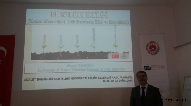\r\n\r\nSözkonusu seminer 15-16 Ekim 2015 ve 22-23 Ekim 2015 tarihlerinde iki ayrı bölümde Antalya İli Aksu İlçesinde bulunan Adalet Teşkilatını Güçlendirme Vakfı Tesislerinde icra edilmiştir. Sözkonusu sunumlarda Etik Eğiticisi Ahmet Sandal, Ülkemizin çeşitli İllerinden gelen yazı işleri müdürlerine mesleki etiği konusunda hitap etmiştir.\r\n\r\nMeslek Etiği Seminerinde etik değerlerin ve kamu yönetimindeki öneminin tarihsel kökenleri ve günümüze yansımaları üzerinde durulmuş, ahilik, loncalar gibi meslek birliklerinin ahlaki değerleri günümüze kadar taşımada büyük rol oynadıkları, zaten her mesleğin kendi bünyesinde taşıdığı halkın fayda ve iyiliğine yönelik her türlü mesleki ilke ve kuralların aynı zamanda birer etik değerler hükmünde olduğu, her mesleğin kendine ait özel mesleki etik kuralları olmakla birlikte, “adalet, doğruluk, dürüstlük, tarafsızlık, meslekî ehliyet, meslek sırrına sadık kalmak” gibi ilkelerin her meslek için geçerli olduğu, bunların yanında kamu görevlileri için ayrıca, 2004 yılında Kamu Görevlileri Etik Kurulu Kurulması Hakkında Kanun ve 2005 yılında Kamu Görevlileri Etik Davranış İlkeleri ile Başvuru Usul ve Esasları Hakkında Yönetmeliğin yürürlüğe girdiği ve bu Kanun ve Yönetmelikte 18 etik değerin belirlenerek her kamu görevlisi için uyulmasının mutlak bir zaruret olduğu, bu değerlerin sırasıyla “görevin yerine getirilmesinde kamu hizmeti bilinci taşımak, halka hizmet bilincine sahip olmak, hizmet standartlarına uymak, kurumların hedef ve misyona bağlı kalmak, dürüstlük ve tarafsızlık içinde çalışmak, saygınlık ve güvene bağlı kalmak, işyerinde nezaket ve saygı içinde olmak, usulsüzlükleri yetkili makamlara bildirmek, çıkar çatışmasından kaçınmak, görev ve yetkileri menfaat sağlamak amacıyla kullanmamak, hediye alma ve menfaat sağlama yasağına uymak, kamu malları ve kaynaklarının kullanımında hassas olmak, savurganlıktan kaçınmak, bağlayıcı açıklamalar ve gerçek dışı beyanda bulunmamak, bilgi verme, saydamlık ve katılımcılık anlayışına sahip olmak, yöneticilerin hesap verme sorumluluğu içinde olması, eski kamu görevlileriyle ilişkilerini öne çıkararak iş takibi yapmamak ve mal bildiriminde bulunmak” şeklinde olup bu ilkelere aykırı davranan kamu görevlilerini Başbakanlık Kamu Görevlileri Etik Kuruluna ya da her Kurumun kendi Disiplin Kurullarına şikayet etmenin vatandaşlara düşen bir görev olduğu özellikle anlatılmıştır.\r\n\r\nAdalet Bakanlığı Yazı İşleri Müdürlerine yönelik seminerde “Meslek Etiği” ile birlikte Devlet Memurları Kanunu, resmi yazışma kuralları, insan hakları, kadına yönelik şiddetin önlenmesi, iletişim, halkla ilişkiler vb gibi konularda sunumlar gerçekleştirilmiştir. Seminer konularının hepsinin ayrı bir öneme sahip olduğu ve katılanlar tarafından ilgiyle takip edildiği, fayda sağladığı gözlemlenmiştir. Seminer sonunda katılımcılara seminer katılım belgesi takdim edilmiştir.\r\n