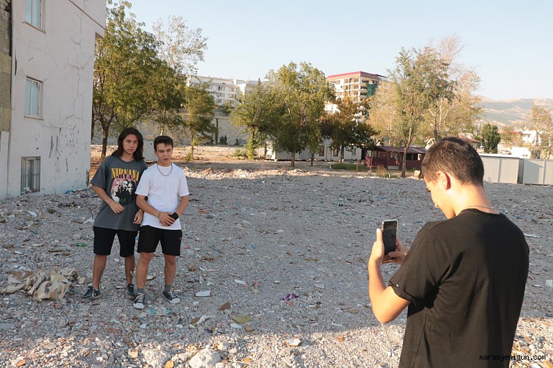 Kahramanmaraş depremlerinin simgesi haline gelen Ebrar Sitesi'nin bulunduğu alanda ayakta kalan tek bina önüne gelen üç genç, asrın felaketini unutmamak için hatıra olsun diye birbirlerinin fotoğrafını çekti.