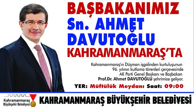 Kahramanmaraş’ın düşman işgalinden kurtuluşunun 96. Yıldönümü kutlama etkinliklerine AK Parti Genel Başkanı ve Başbakan Prof. Dr. Ahmet Davutoğlu da katılacak.