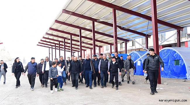 Büyükşehir Belediye Başkanı Hayrettin Güngör, İçişleri Bakanı Süleyman Soylu ile birlikte geçici esnaf çarşılarını ziyaret ederek çalışmalar hakkında son bilgileri aldı.Şehrin tekrar ayağa kaldırılması ve depremzedelerin ihtiyaçlarının eksiksiz olarak karşılanması noktasında gecesini gündüzüne katarak çalışan Kahramanmaraş Büyükşehir Belediye Başkanı Hayrettin Güngör, depremin meydana geldiği ilk günden itibaren Kahramanmaraş’ta olan ve çalışmaları koordine eden İçişleri Bakanı Süleyman Soylu ile birlikte, tamamlanan ve kurulumu devam eden geçici esnaf çarşılarını ziyaret ederek incelemelerde bulundu. Kahramanmaraş Valisi Ömer Faruk Coşkun, koordinatör valiler ve AK Parti Kahramanmaraş Milletvekili Ahmet Özdemir’in de yer aldığı ziyaretlerde heyet, prefabrik ve konteyner çarşılarda gerçekleştirilen çalışmalar hakkında son bilgileri aldı.Esnaflarımız Faaliyetlerine BaşlıyorZiyaretlere ilişkindeğerlendirmelerde bulunan Kahramanmaraş Büyükşehir Belediye Başkanı Hayrettin Güngör, “Şehrimizin ihya ve inşası noktasında Sayın Cumhurbaşkanımızın liderliğinde hükümetimiz, bakanlarımız, milletvekillerimiz ve belediyelerimizle yüksek bir koordinasyon ve dayanışma içerisinde çalışmalarımızı sürdürüyoruz. Şehrimizde ticari hayatın canlandırılması ve esnafımızın faaliyetlerine tekrar başlaması noktasında da yoğun gayret gösteriyoruz. Prefabrik ve konteyner çarşı kurulumlarımız devam ediyor. Bugün de İçişleri Bakanımız Sayın Süleyman Soylu, valilerimiz ve milletvekillerimizle birlikte tamamlanan ve yapımı devam eden geçici esnaf çarşılarını ziyaret ederek incelemelerde bulunduk. Hamdolsun şehrimizde ticari hayatın canlandırılması noktasında önemli aşama kat ettik. Devletimizin tüm kademelerine, Kahramanmaraş'ımızın inşa ve ihyasında birlikte hizmet ettiğimiz tüm kurum ve kuruluşlarımıza canı gönülden teşekkür ediyoruz” cümlelerini kaydetti.