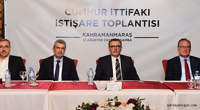 Cumhur İttifakı İstişare Toplantısı’na katılan Büyükşehir Belediye Başkanı Hayrettin Güngör, “İlk günkü heyecan ve inançla 2023 ve nice zaferlere birlikte yürüyeceğiz” dedi. Kahramanmaraş Büyükşehir Belediye Başkanı Hayrettin Güngör, Cumhur İttifakı İstişare Toplantısı’na katıldı. AK Parti Grup Başkanvekili Mahir Ünal’ın öncülüğünde düzenlenen toplantıya, AK Parti İl Başkanı Fırat Görgel, Milliyetçi Hareket Partisi İl Başkanı Ertuğrul Doğan ve parti teşkilatları katıldı. Şehirdeki yatırımlara ve projelere dair görüş alışverişinde bulunulan toplantıda, birlik mesajı verildi. Toplantıya ilişkin açıklamada bulunan Başkan Güngör, “Cumhur İttifakı İstişare Toplantımızı gerçekleştirdik. İlk günkü heyecan ve inançla 2023 ve nice zaferlere birlikte yürüyeceğiz” ifadelerini kaydetti.