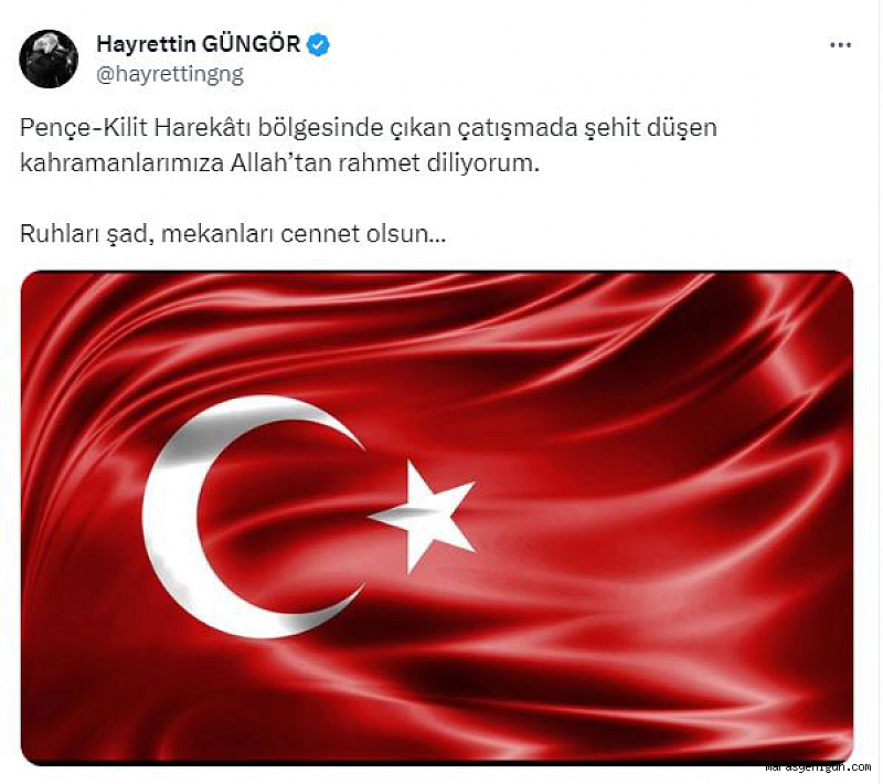 Hakkari Dağ Komando Birliği ve Pençe - Kilit Harekâtı bölgesinde çıkan çatışmada şehit düşen kahraman mehmetçikler için taziye mesajı yayımlayan Başkan Güngör, “Şehit düşen kahramanlarımıza Allah’tan rahmet diliyorum. Ruhları şad, mekânları cennet olsun” dedi.Kahramanmaraş Büyükşehir Belediye Başkanı Hayrettin Güngör, Hakkari Dağ Komando Birliği ve Irak’ın kuzeyindeki Pençe - Kilit Harekâtı bölgesinde bölücü terör örgütü mensuplarıyla çıkan çatışmada şehit düşen kahraman mehmetçikler için taziye mesajı yayımladı. Başkan Hayrettin Güngör mesajında, “Şehit düşen kahramanlarımıza Allah’tan rahmet diliyorum. Ruhları şad, mekânları cennet olsun. Aziz şehitlerimizin kederli ailelerine ve milletimize başsağlığı ve sabır diliyorum” ifadelerine yer verdi.