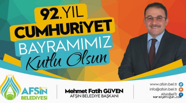 \r\n\r\nBaşkan Güven yayınladığı mesajında şu ifadelere yer verdi: "Türk Milleti, tarih boyunca hürriyetine düşkün olarak yaşamış ve Kurtuluş Savaşını da bu azimle kazanmış bir millettir. Kurtuluş Savaşı, milletimizin var olma mücadelesi, Cumhuriyet ise yeniden dirilişin sembolüdür. 92 inci yılını kutladığımız Cumhuriyet, aziz Türk Milleti’nin her türlü imkânsızlığa rağmen örnek vatan sevgisi, hürriyet ve istiklal aşkıyla gösterdiği kahramanlığın eseridir. Cumhuriyet, birlik ve beraberlik içinde hareket ettiğimizde olmaz denilenleri başardığımızın en büyük ispatıdır. Bütün millet olarak el birliği ve gönül birliğiyle çalışmayı sürdürecek olursak, çok daha güçlü ve çok daha refah bir ülke haline gelmemizin önünde hiçbir engel kalmayacaktır. Farklı dil, inanç ve kültürleri bir arada yaşatan, gönüllerimizi kaynaştıran büyük bir adalet ve barış medeniyetinin mirasçıları olan bizler, kardeşçe birbirimizi kucaklayarak, birbirimize sımsıkı kenetlenerek aydınlık yarınlarımızı hep birlikte kuracağız.\r\n\r\nBu vesileyle, Gazi Mustafa Kemal Atatürk başta olmak üzere, Cumhuriyetimizin kurulmasında emeği geçen bütün istiklal kahramanlarımızı şükranla anıyor, Devlet ve millet olarak yarınlarımıza güvenle bakabildiğimiz bir ortamda Cumhuriyetimizin 92 inci yılını idrak ediyor olmaktan büyük bir mutluluk duyuyor, Afşinli hemşerilerimizin ve tüm Türkiye’nin bu büyük bayramını yürekten kutluyorum “dedi.\r\n\r\n \r\n\r\n \r\n