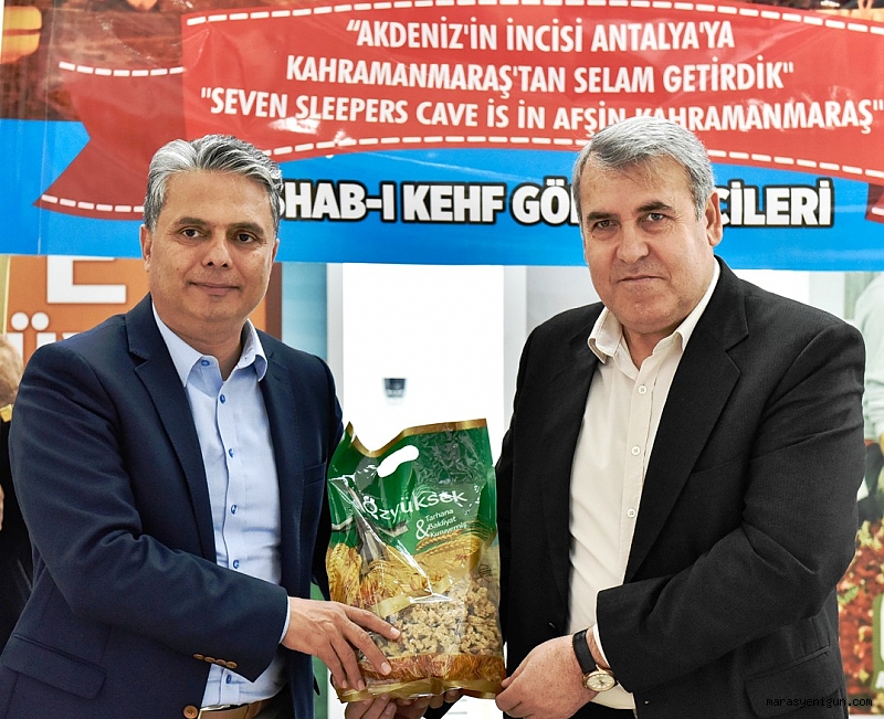 Afşin Eshab-ı Kehf Gönül Elçileri Derneği üyeleri babasının öğretmenliği nedeniyle Kahramanmaraş’ın Afşin ilçesinde doğan Muratpaşa Belediye Başkanı Ümit Uysal’ı ziyaret etti. Kahramanmaraş Büyükşehir Belediyesi’nin destekleriyle 10 yılı aşkın süredir Türkiye’nin farklı illerinde Eshab-ı Kehf Külliyesini tanıtan dernek üyeleri, ‘hemşerileri’ olarak gördükleri Başkan Uysal’a, ilin yöresel ürünlerini hediye etti. Başkan Uysal, ziyaret dolayısıyla memnuniyetini dile getirdi.