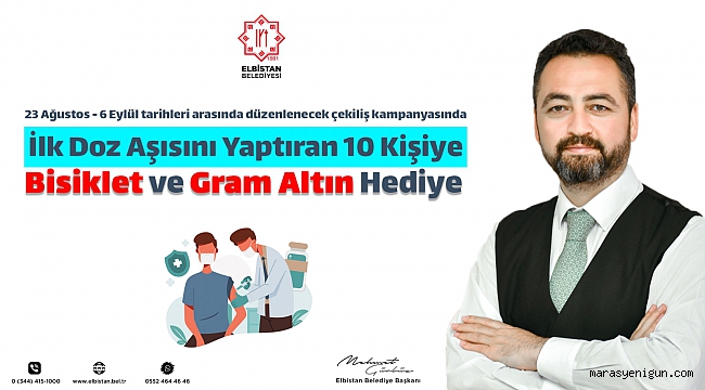 Elbistan’da Covid-19’la mücadele kapsamında 23 Ağustos-6 Eylül tarihleri arasında düzenlenecek kampanya ile ilk doz aşısını yaptıranlar arasından 10 kişiye çekilişle bisiklet ve gram altın hediye edilecek.