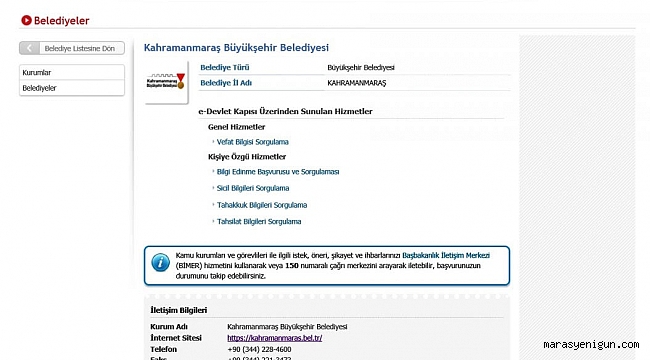 Modern belediyecilik anlayışı ile vatandaşlara en güzel şekilde hizmet veren Kahramanmaraş Büyükşehir Belediyesi, akıllı belediyecilik projelerine bir yenisini daha ekleyerek e-devlet portalı üzerinde hizmet vermeye başladı.E-Devlet portalı üzerinden vatandaşlara hizmet vermeye başlayan Kahramanmaraş Büyükşehir Belediyesi, 5 kalemde hizmet veriyor.Vatandaşlar TC kimlik numarası ve e-devlet şifresi ile sisteme giriş yaptıktan sonra Kahramanmaraş Büyükşehir Belediyesi üzerinden vefat bilgisi, bilgi edinme başvurusu ve sorgulama, sicil bilgileri sorgulama, tahakkuk bilgileri sorgulama, tahsilât bilgileri sorgulama gibi hizmetlerden faydalanabilecekler.