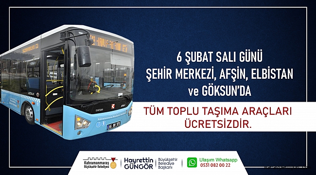 Büyükşehir Belediyesi, 6 Şubat Salı günü şehir merkezi ile Afşin, Elbistan ve Göksun ilçelerinde belediye otobüsleri ve özel halk otobüslerinin ücretsiz toplu taşıma hizmeti vereceğini duyurdu.