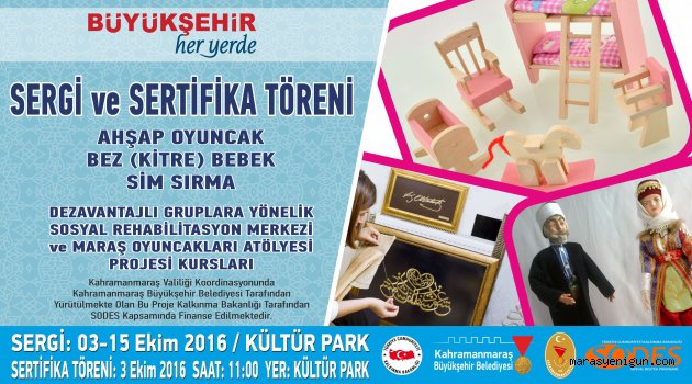 \r\n\r\nSerginin içeriği ile alakalı bir açıklamada bulunan Kadın ve Aile Şube Müdürü Ayşe Taşkıran: “Müdürlüğümüz bünyesinde SODES Projesi kapsamında Dezavantajlı bireylere yönelik düzenlediğimiz kurslarımızın sonunda hem kursiyerlerimize sertifikalarını takdim edeceğiz, hem de kursiyerlerimizin oluşturduğu ürünleri sergileyeceğiz. Kursiyelerimize kurs süresince verdiğimiz Maraş Oyuncakları Atölyesi, Bez(Kitre) Bebek ve Sim Sırma kurslarımıza katılan kursiyerlerimizin ürettiği ürünleri sergileyeceğiz. Atölyelerimizde kurs gören kardeşlerimizin ürettikleri ahşap oyuncaklar, çocuklarımız açısından daha sağlıklı olmaktadır. Çin malı plastik oyuncaklar yerine daha sağlıklı ve organik ahşap oyuncakları çocuklarımız gönül rahatlığı ile kullanabilirler.