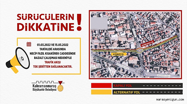 Büyükşehir Belediyesi, yol genişletme çalışmaları dolayısıyla İsa Divanlı Mahallesi Güllü Hoca Caddesi’nde bulunan yolun 11 Mart Cuma gününe kadar trafiğe kapalı olacağını duyurdu. Necip Fazıl Kısakürek Bulvarı’nda ise devam eden yol bakım ve onarım çalışmaları nedeniyle trafik tek şeritten devam edecek.Kahramanmaraş Büyükşehir Belediyesi, Dulkadiroğlu İsa Divanlı Mahallesi’ndeyol genişletme çalışmaları gerçekleştiriyor. Bu kapsamda, Ulaşım Hizmetleri Dairesi Başkanlığı tarafından alınan karar doğrultusunda Güllü Hoca Caddesi’nde bulunan yol 11 Mart Cuma gününe kadar trafiğe kapalı olacak. Yıkım ve hafriyat çalışmalarının tamamlanmasının ardından yol tekrardan güvenli bir şekilde trafiğe açılacak. Onikişubat’ta Necip Fazıl Kısakürek Bulvarı’nda ise devam eden bazalt çalışmaları nedeniyle 15 Mart Salı gününe kadar mevcut yolda trafik tek şeritten devam edecek.Alternatif Güzergâhlar Tercih EdilmeliUlaşım Hizmetleri Dairesi Başkanlığı’ndan yol kapama kararlarına ilişkin yapılan açıklamada, “Dulkadiroğlu İsa Divanlı Mahallesi’nde gerçekleştirilecek olan yol genişletme çalışmaları dolayısıyla bölgede farklı parsellerde yer alan 3 yapıda yıkım çalışmaları devam ediyor. Bu kapsamda, Güllü Hoca Caddesi’ndeki yolumuz 11 Mart tarihine kadar trafiğe kapatılmıştır. Yıkım ve hafriyat çalışmalarının tamamlanmasının ardından mevcut yol trafiğe açılacak. Onikişubat’ta Necip Fazıl Kısakürek Bulvarı’nda ise yol bakım ve onarım çalışmaları nedeniyle 15 Mart tarihine kadar trafik tek şeritten devam edecek. Vatandaşlarımızın trafikte aksaklık yaşamaması için alternatif güzergâhları kullanmaları önem arz etmektedir” ifadelerine yer verildi.