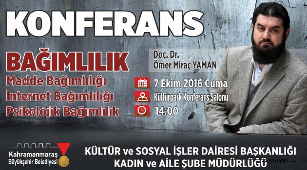 \r\n\r\nKültürpark Konferans Salonu’nda 7 Ekim 2016 Cuma günü saat 14.00’te gerçekleştirilecek konferansta Doç. Dr. Ömer Meriç Yaman, madde bağımlılığı, internet bağımlılığı ve psikolojik bağımlılık gibi konularda katılımcıları bilgilendirecek.