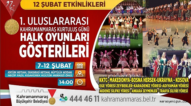Kahramanmaraş Büyükşehir Belediyesi bir ilke daha imza atarak uluslararası halk oyunları gösterileri düzenliyor.Kahramanmaraş’ın tanıtımına ışık tutacak 1. Uluslararası Kahramanmaraş Kurtuluş Günü Halk Oyunları Gösterileri 8-12 Şubat tarihleri arasında ilçelerde gerçekleştirilecek.Kahramanmaraş’ın düşman işgalinden kurtuluşunun 97. Yıldönümü kutlama etkinlikleri çerçevesince 8-12 Şubat 2017 tarihleri arasında gerçekleştirilecek olan 1. Uluslararası Kahramanmaraş Kurtuluş Günü Halk Oyunları Gösterileri 6 ülkeden ve 6 şehirden katılacak olan Halk Oyunları ekiplerince gerçekleştirilecek.Kahramanmaraş Büyükşehir Belediyesi Kültür ve Sosyal İşler Dairesi Başkanlığı Kültür ve Turizm Şube Müdürlüğü’nce organize edilecek Halk Oyunları Gösterilerine Kuzey Kıbrıs Türk Cumhuriyeti, Ukrayna, Makedonya, Bosna-Hersek, Adige ve Kosova ülkelerinin folklor takımlarının yanı sıra Trabzon, Ankara, Adıyaman, Trakya, İzmir ve Silifke Halk Oyunları Takımları kendi yörelerinin halk oyunlarını sunacaklar.İlk program 7 Şubat Salı günü saat 14.00’te Demokrasi Meydanı’nda ve saat19.00-20.00 arasında Göksun’da iki ülke ve iki şehir Halk Oyunları ekiplerinin katılımı ile gerçekleştirilecek.İkinci program 8 Şubat 2017 Çarşamba günü Atatürk Meydanı’nda saat 14.00’te ve Afşin’de saat 19.00-20.00 arasında iki ülke ve iki şehir Halk Oyunları ekiplerinin katılımı ile gerçekleştirilecek.Üçüncü program 9 Şubat Perşembe günü Necip Fazıl Kısakürek Kültür Merkezi’nde saat 14.00’de, Elbistan’da ise saat 19.00-20.00 arasında iki ülke ve iki şehir Halk Oyunları ekiplerinin katılımı ile gerçekleştirilecek.Dördüncü program 10 Şubat 2017 Cuma günü saat 14.00’te Demokrasi Meydanı’nda iki ülke ve iki şehir Halk Oyunları ekiplerinin katılımı ile gerçekleştirilecek.Beşinci program ise 11 Şubat 2017 akşamı tören alanında (Valilik Kavşağı) bütün ülke ve şehir halk oyunları ekiplerinin katılımı ile gerçekleştirilecek.