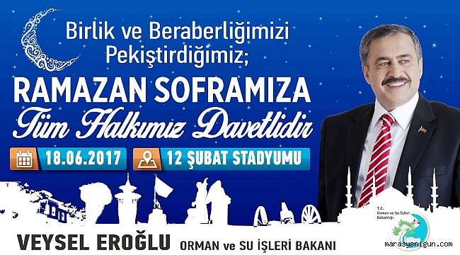 Başbakan Yardımcısı Veysi Kaynak ile Orman ve Su İşleri Bakanı Veysel Eroğlu’nun da katılacağı iftar programı 12 Şubat Stadyumu’nda 18 Haziran 2017 Pazar günü gerçekleştirilecek.Bir dizi açılış, temel atma ve incelemelerde bulunmak üzere Kahramanmaraş’a gelecek olan Orman ve Su İşleri Bakanı Veysel Eroğlu, aynı zamanda Kahramanmaraş Büyükşehir Belediyesi’nce 12 Şubat Stadyumu’nda gerçekleştirilecek iftar yemeğine de katılacak.Konu ile ilgili olarak Büyükşehir Belediyesi’nden yapılan yazılı açıklamada: “Büyükşehir Belediyemiz öncülüğünde 18 Haziran 2017 Pazar günü 12 Şubat Stadyumu’nda gerçekleştireceğimiz; Başbakan Yardımcımız Veysi Kaynak ile Orman ve Su İşleri Bakanımız Veysel Eroğlu’nun da katılacağı 10 bin kişilik iftar programına tüm hemşehrilerimiz davetlidir” denildi.