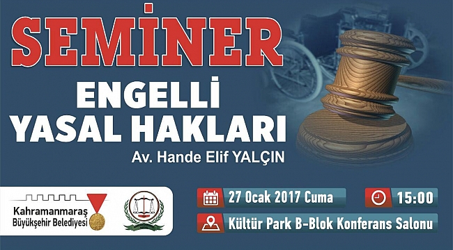 Kahramanmaraş Büyükşehir Belediyesi ile Kahramanmaraş Barosu’nun birlikte düzenleyecekleri eğitim seminerinde engellilere yasada tanınan hakları anlatılacak.Kahramanmaraş Barosu avukatlarından Av. Hande Elif Yalçın’ın engellilere sunacağı eğitim seminerinde engelli yasal hakları ele alınarak, engellilerden gelecek sorulara cevaplandırılacak.Kahramanmaraş Büyükşehir Belediyesi Sağlık ve Sosyal hizmetler Dairesi Başkanlığı Engelliler Şube Müdürlüğü tarafından gerçekleştirilecek olan seminere tüm engelli vatandaşlar davet edildi.Kültürpark Konferans Salonunda 27 Ocak 2017 Cuma günü gerçekleştirilecek olan Engelli Yasal Hakları eğitim semineri saat 15.00’de başlayacak.