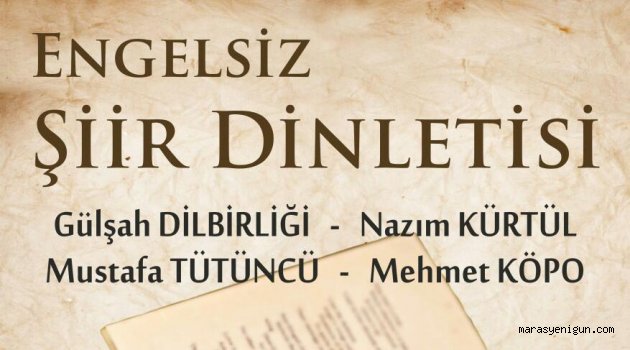 \r\n\r\nKültürpark Konferans Salonu’nda düzenlenecek olan ‘Engelsiz Şiir Dinletisi’ne Gülşah Dilbirliği, Nazım Kürtül, Mustafa Tütüncü ve Mehmet Köpo katılacaklar.