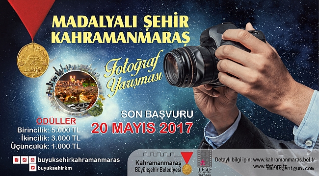 Kahramanmaraş Büyükşehir Belediyesi İl Genelini Kapsayacak Şekilde Bir Fotoğraf Yarışması Düzenliyor.Kahramanmaraş Büyükşehir Belediyesi Sağlık ve Sosyal Hizmetler Dairesi Başkanlığı Mesleki Eğitim Şube Müdürlüğünce yürütülecek Fotoğraf Yarışması’nda son müracaat tarihi 20 Mayıs 2017 olarak açıklandı.Kahramanmaraş’ın doğal, kültürel ve tarihi yönlerini anlatacak fotoğrafları konu olacağı yarışmaya katılmak isteyenler; http://www.tfsfonayliyarismalar.org/yarisma_detay.asp?s=269 adresinden detaylı bilgi alabilirler.Yarışmaya katılacak olan eserler arasında yapılacak değerlendirme sonrasında birinciye 5 bin TL, ikinciye 3 bin TL ve üçüncüye bin TL ödül verilecek.Yarışmaya katılacak olan yarışmacılar, çektikleri fotoğrafları digital ortamda yukarıda verilen linkten faydalanarak gönderecekler.20 Mayıs 2017 tarihine kadar gönderilecek olan eserler 23 Mayıs 2017 tarihinde toplanacak seçiçi kurul tarafından değerlendirilecek ve sonuçlar 26 Mayıs 2017 tarihinde açıklanacak.