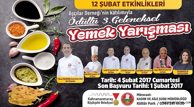 Kahramanmaraş Büyükşehir Belediyesi Ödüllü 3. Geleneksel Yemek Yarışması 4 Şubat 2017 Cumartesi günü yapacak.