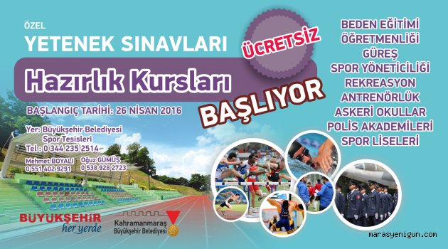 Konu ile ilgili olarak Gençlik ve Spor Şube Müdürlüğü’nden yapılan yazılı açıklamada: “Özel Yetenek Sınavlarına Hazırlık kursu 26.04.2016 tarihinde Gençlik ve Spor Şube Müdürlüğünün koordinesinde Büyükşehir Belediyesi Spor tesislerinde başlıyor. Sosyal Belediyecilik anlayışı kapsamında ücretsiz olarak yapılacak kurslara herkes başvurabilir. Kurslar aşağıda sıralanan branşları kapsamaktadır.