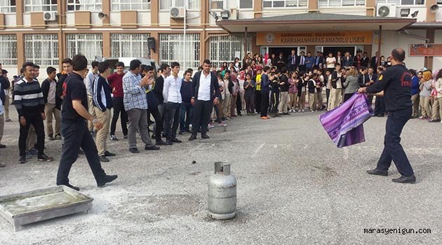 \r\n\r\nTeorik anlatımlar sonrası, yangın ve deprem tatbikatına geçildi. Okulda alarm çalınarak öğrencilerin bahçeye belirli bir düzen dahilinde intikali sağlandı. Daha sonra AKMOD arama kurtarma moral destek ekibi elemanları sedye ile merdivenli itfaiye aracı ise üst katlarda mahsur kalan yaralıları dışarı tahliye ettiler. Eğitmenler tarafından çıkarılan kontrollü yangın kuru kimyevi tozla söndürülerek, yangın söndürme tüpünün kullanılışı gösterildi.