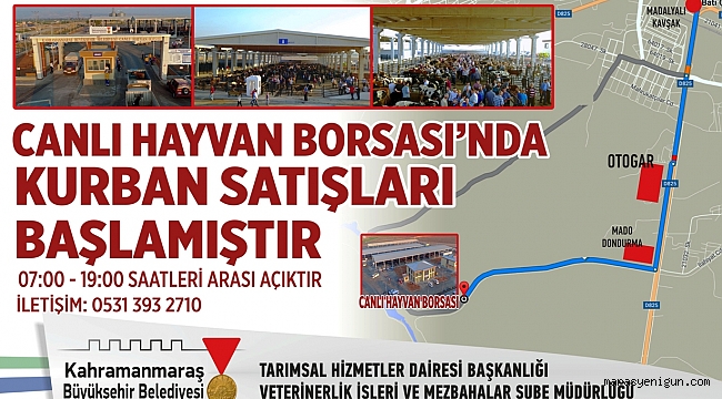 Kahramanmaraş Büyükşehir Belediyesi tarafında yaptırılarak geçtiğimiz günlerde hizmet vermeye başlayan Canlı Hayvan Borsası’nda kurban satışlarının başladığı belirtildi.