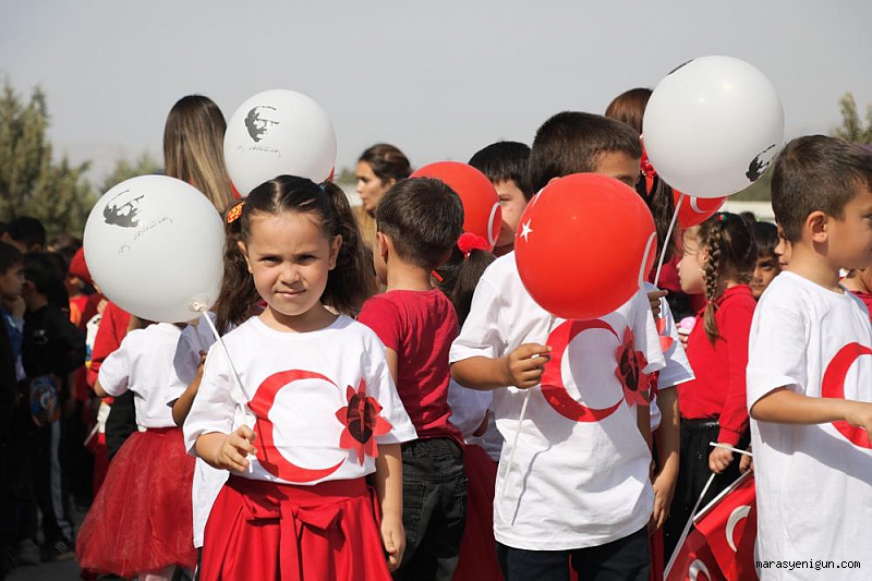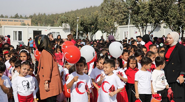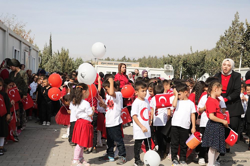 Kahramanmaraş Karacasu Konteyner Kent'te eğitim gören ilkokul öğrencileri, konteyner sınıflarının önünde Cumhuriyet'in ilanının 100. yılını düzenledikleri etkinlikle kutladı.