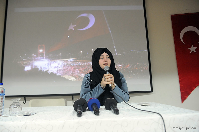 Kültürpark Konferans Salonu’nda gerçekleştirilen programda ilk olarak kürsüye Kahramanmaraş Büyükşehir Belediyesi Kadın ve Aile Şube Müdürü Ayşe Sofioğlu geldi.Şube Müdürü Sofioğlu, Kadın ve Aile Şube Müdürlüğü olarak her zaman Kahramanmaraş halkına hizmet verdiklerini ve vermeye de devam edeceklerini ifade ederek: “Büyükşehir Belediyemiz Aile Danışma ve Eğitim Merkezleri aracılığıyla hem ailelerimize hem de öğrencilerimize ücretsiz danışmanlık hizmetleri vermektedir” dedi.Programda daha sonra şair Esra Şahin ve Şair Yaşar Demirel birer şiir okudular. 15 Temmuz’u anlatan slaytın izlenmesinin ardından kürsüye 15 Temmuz Gazisi Safiye Bayat geldi.Gazi Safiye Bayat 15 Temmuz’da gerçekleştirilmek istenen kalkışmadan bugünlere kadar yaşanan süreci değerlendirerek, İstanbul’da meydana gelen ve birbirini takip eden olaylar zincirini anlattı.Daha sonra program Kur’an-ı Kerim Tilaveti ile sonlandırılırken, programın sonunda AK Parti Kahramanmaraş Kadın Kolları Başkanı Ayşe Cesur ve Kadın Kolları Şube Başkanı Ayşe Sofioğlu 15 Temmuz Gazisi Safiye Bayat’a çiçek ve hediye takdim ederek teşekkür ettiler.