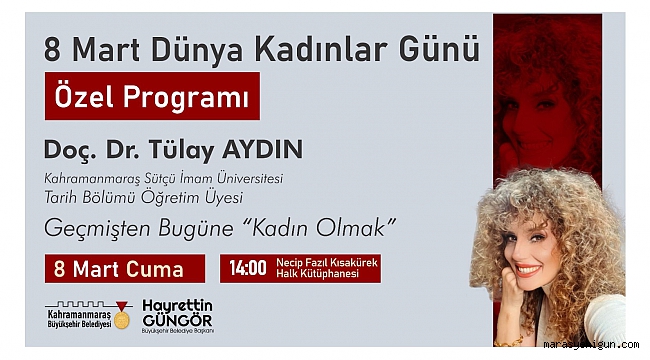 Büyükşehir Belediyesi, Dünya Kadınlar Günü dolayısıyla 8 Mart Cuma Günü NFK Halk Kütüphanesi’nde KSÜ Tarih Bölümü Öğretim Üyesi Doç. Dr. Tülay Aydın’ın katılımıyla “Geçmişten Bugüne Kadın Olmak” konulu söyleşi düzenleyecek.Şiir ve edebiyatın başkentinde kültür sanat faaliyetlerini kesintisiz sürdüren Kahramanmaraş Büyükşehir Belediyesi, 8 Mart Dünya Kadınlar Günü dolayısıyla anlamlı bir programa daha ev sahipliği yapacak. 8 Mart Cuma günü Necip Fazıl Kısakürek Halk Kütüphanesi’nde gerçekleştirecek özel programda KSÜ Tarih Bölümü Öğretim Üyesi Doç. Dr. Tülay Aydın, “Geçmişten Bugüne Kadın Olmak” konusunu ele alacak. Saat 14.00’da başlayacak söyleşide Tülay Aydın; kadının ailede, sosyal alanda ve iş hayatındaki yeri ve önemine değinecek. Büyükşehir Belediyesinden yapılan açıklamada, programa tüm vatandaşların davetli olduğu belirtildi.