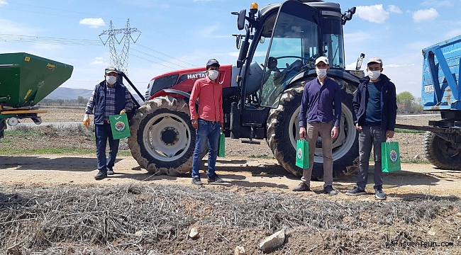 Kahramanmaraş’ın Elbistan ilçesinde Ziraat Odası tarafından korona virüse (Kovid-19) karşı çiftçilerden alınan tedbirlere uymalarını isteyerek maske, eldiven ve şapka dağıtıldı.