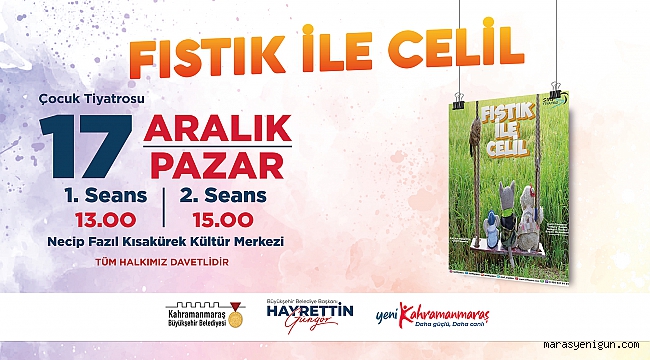 Büyükşehir Belediyesi, 17 Aralık Pazar günü NFK Kültür Merkezi’nde ‘Fıstık ile Celil’ adlı tiyatro gösterisini çocuklarla buluşturacak. Ücretsiz olarak gerçekleştirilecek gösteriye tüm çocuklar davet edildi.