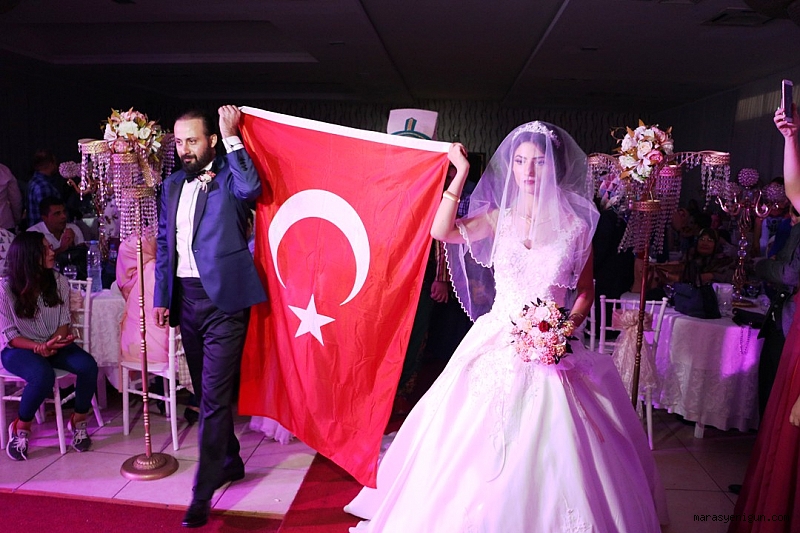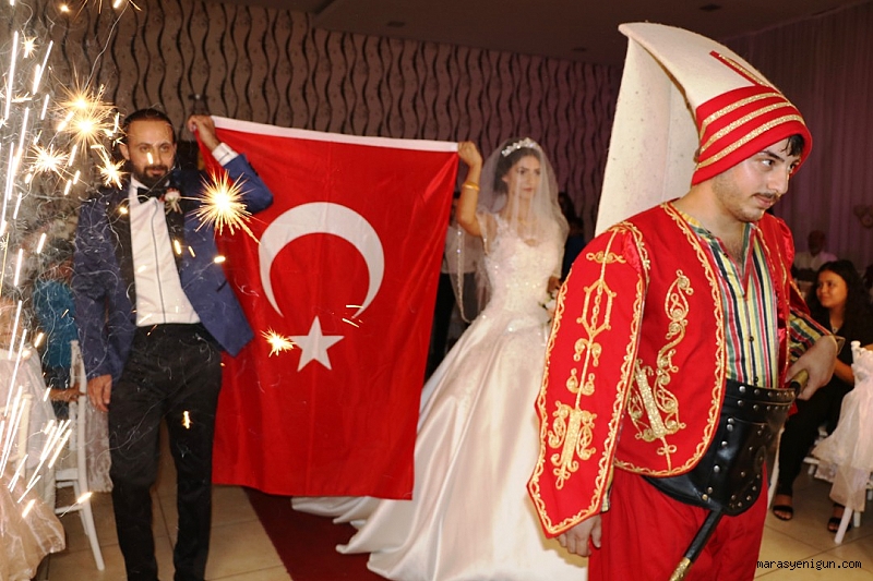 Kahramanmaraş’ta yaşayan Raşit Taşgetiren ve Melike Karaaslan düzenledikleri düğün gecesinde dünya evine girdi. Düğün salonuna gelen misafirleri iki adet Osmanlı askerleri karşıladı. Aynı Yeniçeri askerleri gelin ve damadın salona girişinde de eşlik ederken, çiçeği burnundaki çift birlikte tutukları Türk bayrağını ile salona girerek katılımcılardan alkış aldı. Ardından birlikte dans ve oyun oynayan çift, meşhur Maraş dondurmasını baltayla kesmenin mutluluğunu da yaşadı. Düğüne katılan misafirlere de dondurma şovu yapıldı.