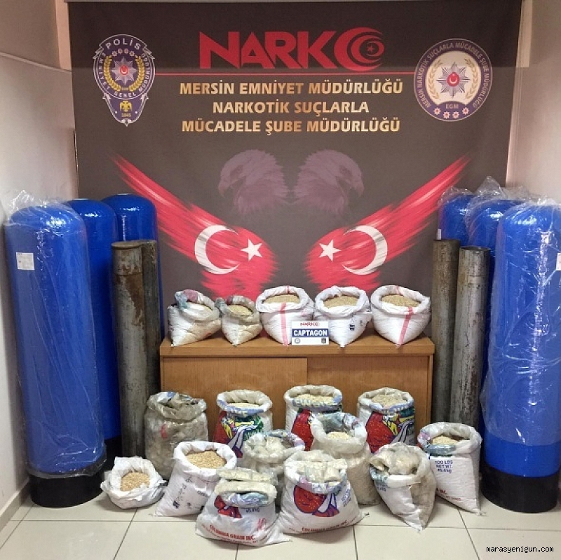 Edinilen bilgiye göre, Mersin İl Emniyet Müdürlüğü`ne bağlı Narkotik Suçlarla Mücadele Şube Müdürlüğü ekipleri, yurt dışından Türkiye`ye yüklü miktarda captagon uyuşturucu hap sokulduğunu belirledi.Bunun üzerine çalışma başlatan ekipler, hapları getiren suç örgütünün bu hapları çeşitli yollar ve yöntemlerle farklı ülkelere gönderdiklerini tespit etti. Uzun süre şahısları takip eden ekipler, bir depoya operasyon düzenledi.Operasyonda 6 kişi gözaltına alınırken, depoda da arama yapıldı. Aramada zeminde bulunan gizli tünelde ve büyük silindir borular içerisinde 326 kilo 450 gram ağırlığında 1 milyon 958 bin 700 adet captagon uyuşturucu hap ele geçirildi.Uyuşturucu tacirlerinin hapların nemlenmesini önlemek için çuval ve silindirlerin içine özel madde döktüğü belirlendi.Olayla ilgili çalışma devam ediyor.