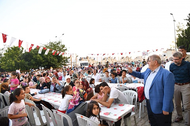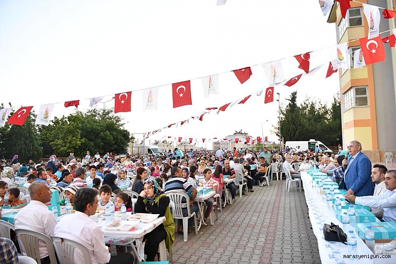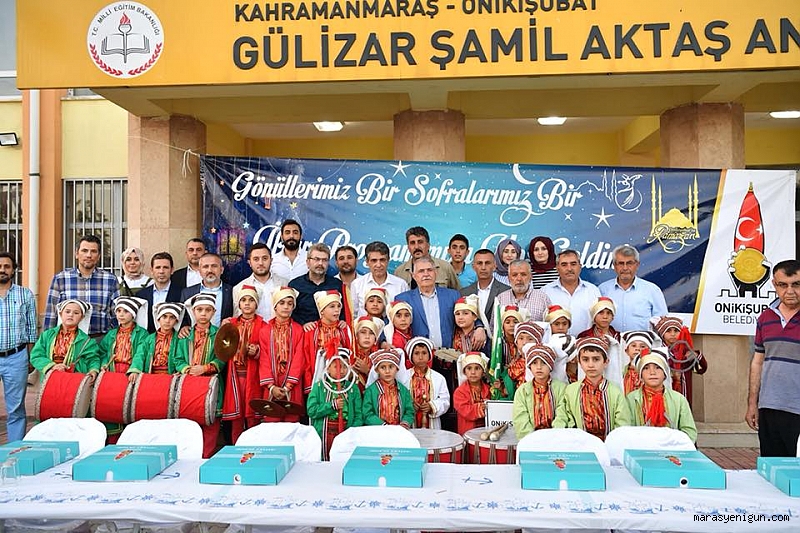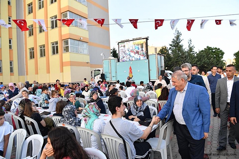 Onikişubat Belediyesi “Gönüllerimiz Bir Sofralarımız Bir” sloganıyla bu yıl Ramazan ayında ilçesinin hemen hemen her mahallesinde ve ülke dışında Bosna Hersek’te bulunan kardeş belediye BosanskaKrupa ile Mardin Ömerli ilçesi de dâhil olmak üzere vatandaşlarla sofrasını, ekmeğini paylaştı. Belediye Başkanı Hanefi Mahçiçek, vatandaşlarla el açıp, dua ettiği her sofrada birlik ve beraberlik mesajı verdi. Yine Onikişubat’ta gönüllerin bir olduğu sofralardan biri Gülizar Şamil Aktaş Lisesi’nde açıldı.İftar vakti öncesinde alana gelen Onikişubat Belediye Başkanı Hanefi Mahçiçek, vatandaşlarla tek tek selamlaşarak sohbet etti. Çocukları kucaklamasının ardından iftar programının ikram sahibi olan Derya Ongun’a hediye takdim eden Başkan Mahçiçek, teşekkür dileklerini iletti.Daha sonra Onikişubat Belediyesi Çocuk Mehteran Takımı gösterisi ile devam eden iftar programına vatandaşlar yoğun ilgi gösterdi.İftarda konuşma yapan Başkan Mahçiçek öncelikle vatandaşlara iftar programına teşrif ettikleri için teşekkür ederek “ böyle bir Ramazan akşamında beraber olma imkânı bulduk. İnşallah gönüllerimiz bir, sofralarımızda bir olsun. Gönüllerimizi bütünleyelim ekmeğimizi soframızı paylaşalım.”ifadelerine yer verdi.Ayrıca Kadir Gecesi ile ilgili de bir konuşma yapan Başkan Mahçiçek“ Kadir Gecemizin rahmetinden, bereketinden istifade edelim diye temenni ve dua ediyorum. Birkaç gün sonra da Ramazan Bayramına ulaşmış olacağız. Ben çocuklarınızla, ailelerinizle beraber sağlık, mutluluk içerisinde böyle mübarek, güzel Ramazan akşamlarında buluşmak dileğiyle diyorum” ifadelerini kullanarak, davete icabet eden vatandaşlara teşekkür etti ve afiyet olsun dileklerini iletti.