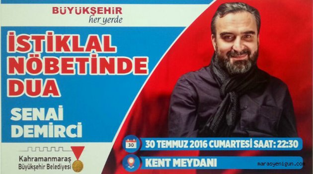 \r\n\r\nYine Büyükşehir Belediyesi’nin davetlisi olarak Kahramanmaraş’a gelecek olan Senai Demirci Demokrasi Nöbetinde Dua programında Kent Meydanı’nda 30 Temmuz 2016 Cumartesi günü saat 22.30’da Kahramanmaraş Halkı ile buluşacak.