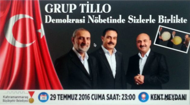 Büyükşehir Belediyesi’nin davetlisi olarak Kahramanmaraş’a gelecek olan Grup Tillo 29 Temmuz 2016 Cuma günü akşam saat 23.00’da Kent Meydanı’nda Kahramanmaraşlılarla buluşarak, Demokrasi nöbetine destek verecekler.