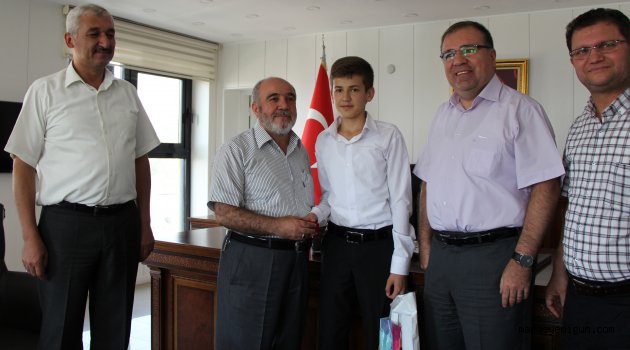 \r\n\r\nKahramanmaraş Dulkadiroğlu İlçe Kaymakamı Mehmet Türköz, Diyanet İşleri Başkanlığınca Rize de yapılan 32. Türkiye Hafızlık Yarışması'nın finalinde, birinci olan Hafız Raşit Tayyip Fındık’a hediye vererek ödüllendirdi. Törende Dulkadiroğlu İlçe Müftüsü İsmail Günay’da hafıza altın takdim etti.\r\n\r\nDulkadiroğlu İlçe sınırları içerisinde bulunan Şehadet Kuran Kursu öğrencisi Hafız Raşit Tayyip Fındık 10 aylık bir çalışmayla hafız olduğu belirlendi. Türkiye genelinden 5 bin 804 öğrencinin yarışmaya katıldığı, bunlar arasında 3 bin 859 öğrencinin başarılı olduğunu ve bölgelerde gerçekleştirilen sınavlar sonucunda Türkiye birinciliğini elde eden hafıza ilgi büyük.\r\n\r\nDulkadiroğlu İlçe Kaymakamı Mehmet Türköz makamında İlçe Müftüsü İsmail Günay, Türkiye birincisi hafız Raşit Tayyip Fındık, Şahadet Kuran Kursu Müdürü ve aynı zamanda Hocası Mustafa Uçar, Müftülük personeli Halil İbrahim Arıkmert, Diyanet Tv Muhabiri Hacı Ali Güneçıkan’ın da aralarında bulunduğu heyeti kabul etti. Kaymakam Türköz burada hafız Raşit Tayyip Fındıkı çeşitli hediyelerle ödüllendirdi. İlçe Müftüsü İsmail Günay da hafıza altın takdim etti. Törende Kurs hocası Mustafa Uçar’a Dulkadiroğlu İlçe Kaymakamı Mehmet Türköz tarafından başarı belgesi verildi.\r\n\r\nDulkadiroğlu İlçe Kaymakamı Mehmet Türköz burada, hafızlığın zor kazanılan bir unvan olduğunu vurguladı. Kaymakam Türköz konuşmasında; “Rizede yapılan hafızlık yarışmasında ilçemiz Şahadet Kuran Kursundan hafızımız Türkiye birincisi olarak bizleri gururlandırdı. Kendisine teşekkür ediyoruz. Öncelikle bu kendisi için büyük bir görev, önemli bir unvan. Hafızlık zor kazanılan bir unvan olduğu gibi onu taşımak daha zor. Ama kendisinin bu unvanı ömrünün sonuna kadar taşıyacağına ben eminim.”\r\n\r\nKaymakam Mehmet Türköz bu başarıda emeği olan Şahadet Kuran Kursu Hocası Mustafa Uçara da teşekkür ederek; “Bu Kuran Kurslarımızda inşallah daha nice hafızlar yetişecek, vatandaşlara hizmet edecek düşüncesindeyiz. Tabi bu arada İlçe Müftümüz İsmail Günay beyi de es geçmeyelim. 2 yıllık bir kuruluşumuz olmasına rağmen onlarda İlçemizdeki tüm cami ve Kurslarımıza nüfus ederek onları himayelerinde tüm İmam hatip ve Müezzinlerimizle hizmet veriyorlar. Ne mutlu bizlere diyorum. İnşallah Hafızlarımız bundan sonraki yarışmalarda da aynı başarılarla bizleri mutlu edeceklerine inanıyoruz.”\r\n\r\nDulkadiroğlu İlçe Müftüsü İsmail Günay alınan bu başarının ardından Kaymakam Mehmet Türköz’ün yanlarında olmasından gurur duyduklarını belirtti. Müftü Günay ayrıca; Rize de yapılan Türkiye hafızlık yarışmasında birinci olan Raşit Tayyip Fındık ve Kurs öğreticisi Mustafa Uçar’ı tebrik etti, alınan derecenin Kahramanmaraş’a ve Dulkadiroğlu İlçesine hayırlı olması dileğinde bulundu.\r\n\r\nProgramda Dulkadiroğlu İlçe Kaymakam Mehmet Türköz’ün hafız Raşit Tayyip Fındıktan Devlet büyüklerimiz için de dua isteği hoş gülümsemelerle son buldu.\r\n\r\nPrograma Dulkadiroğlu İlçe Milli Eğitim Müdürü Halil İbrahim Çolakkadı da hazır bulundu. İlçe Milli Eğitim Müdürü Çolakkadı, İlçe Müftüsü İsmail Günay nezdinde hafız öğrenci ve öğreticisini tebrik etti.\r\n\r\nHABER- KAMERA: HACI ALİ GÜNEÇIKAN\r\n\r\n \r\n