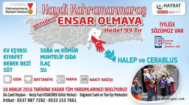 \r\n\r\nKahramanmaraş Büyükşehir Belediyesi ve hayrat Vakfı işbirliği ile Halep ve Cerablus kentleri için başlatılan yardım kampanyası 18 Aralık 2016’ya kadar devam edecek ve bu kampanya kapsamında 99 tır yardım hedefleniyor.\r\n\r\n“Haydi Kahramanmaraş Yeniden Ensar Olmaya” sloganıyla başlatılan yardım kampanyası kapsamında ev eşyası, kıyafet, bebek bezi, mama, süt, soba ve kömür, battaniye, muhtelif gıda, ilaç, su ve nakit bağış gibi yardımların toplanacağı kampanyaya destek vermek isteyen Kahramanmaraşlı hayırseverler, Ulucamii yanı, Necip Fazıl Kısakürek Kültür Merkezi önü ile Doğukent Camii ve tüm ilçe merkezlerindeki yardım tırına yardımda bulunabilirler.\r\n\r\nAyrıca kampanya kapsamında cep telefonlarından 46 yazarak 3674’e sms gönderilmesi durumunda 5 TL bağış yapılmış olacak.\r\n\r\nKampanyaya destek vermek isteyen hayırsever vatandaşlarımız 0537 887 7282 ve 0533 153 7661 numaralı telefonları arayarak irtibata geçebilecekler.\r\n\r\n \r\n