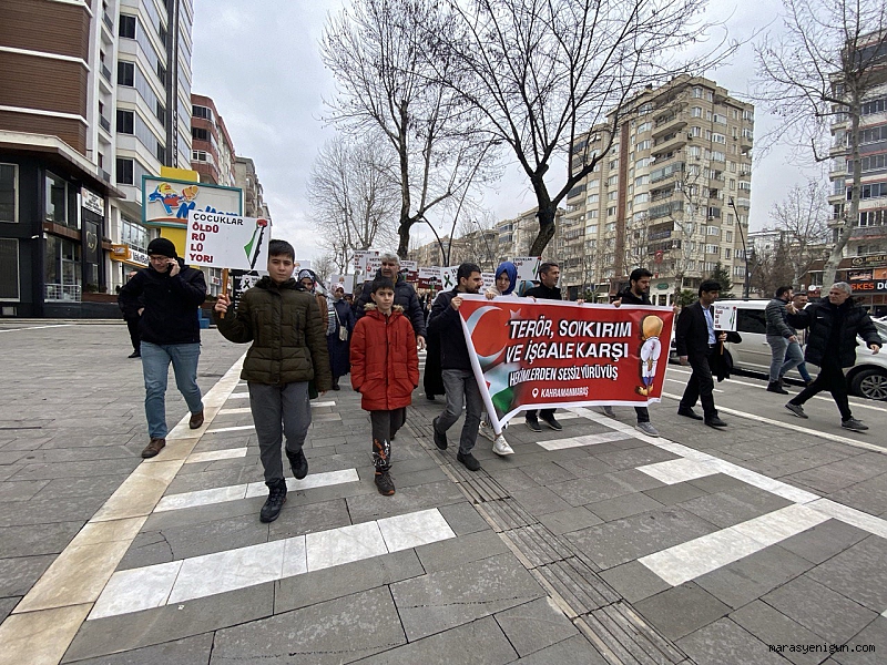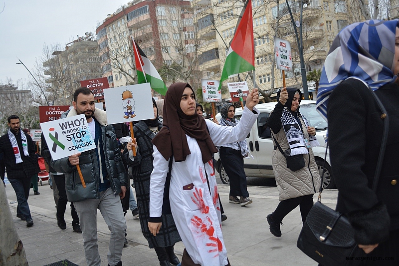 Kahramanmaraş’ta görev yapan hekim ve sağlık çalışanları, İsrail'in Gazze'ye yönelik saldırılarına tepki göstermek için "sessiz yürüyüş" düzenledi.Kahramanmaraş’ta çeşitli hastanelerde görev yapan hekim ve sağlık çalışanları İsrail'in Gazze'ye yönelik saldırılarına tepki göstermek için giydikleri kanlı önlük ve açtıkları pankartlarla sessiz yürüyüş düzenledi.Merkez Onikişubat ilçesi Alparslan Türkeş Bulvarı’nda bir araya gelen hekim ve sağlık çalışanları, ellerindeki Filistin bayrakları ve İsrail aleyhine Türkçe ve İngilizce yazıların yer aldığı dövizler eşliğinde Necip Fazıl Kısakürek Kültür Merkezi önüne kadar yürüdü. Burada grup adına basın açıklamasını okuyan Dr. Gözde Koyuncu, “Tam 30 hastane ve 53 sağlık merkezi hizmet dışı bırakıldı. Han Yunus’taki Nasr Hastanesi’ne sığınan sivilleri kuşatma altına alan işgal birlikleri hastaneyi zorla tahliye ediyor. Yine de meslektaşlarımız, sağlık çalışanları elektriksiz, susuz, oksijensiz, ilaçsız şartlarda tedavi vermek için destansı bir şekilde mücadele veriyor. Bütün bu saldırılar yetmiyormuş gibi Gazze’ye insani yardımın girilmesine izin verilmiyor. Filistin’in her gün binlerce tır yardıma ihtiyacı varken, günde 5-5 tırın girilmesine izin veriliyor. Biz hekimler ve sağlık çalışanları olarak buradan bütün meslektaşlarımıza ve halkımıza sesleniyoruz. Hayatımızın her alanında mesleklerimizde boykot çağrımızı tekrarlıyoruz. Şirketlerin açıkladığı son rakamlardan anlıyoruz ki, günlük hayatımızda gösterdiğimiz en ufak boykot çabası, hep birlikte olursak çığ gibi büyüyor. Tüm meslektaşlarımıza zulme destek olan ilaç firmalarını boykota devam etmeyi hatırlatıyor, Sağlık Bakanlığı yetkililerinden de aynı hassasiyeti hastane eczanelerinde göstermelerini bekliyoruz. Buradan devletimize sesleniyoruz, Filistinli kardeşlerimizin yararına olacak bütün adımları destekliyoruz ve sonuna kadar arkasındayız. Bu konuda sağlık çalışanları olarak gereken bütün desteği gücümüz yettiğince vermeye hazırız” dedi.