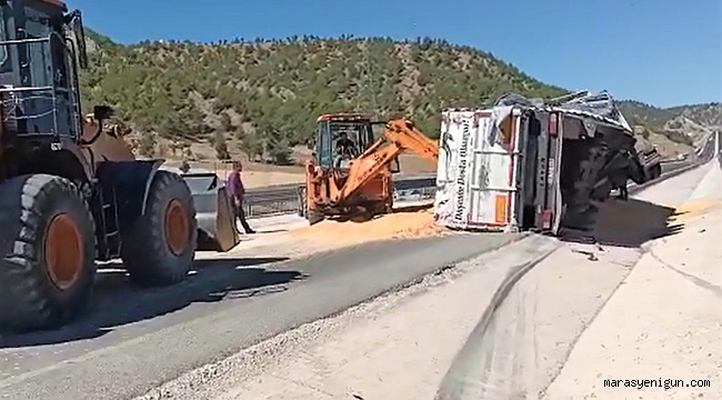 Kahramanmaraş’ta hububat yüklü tırın dorsesi yan yatması sonucu trafik kazası meydana geldi.