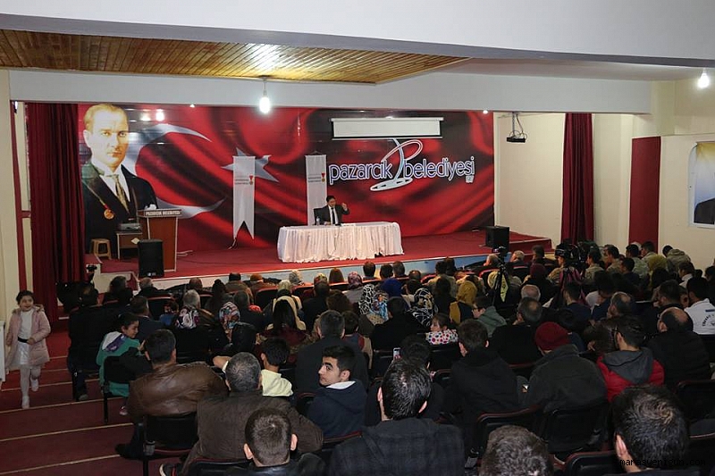 Pazarcık Belediyesi konferans salonunda ‘’Çanakkale Geçilmez ve Çanakkale’nin Maraşlı Şehitleri’’ adlı konferans’a Pazarcık Belediye Başkanı Yakup Hamdi Bozdağ, Kahramanmaraş Kültür Turizm Şube Müdürü Mustafa Semerci, Pazarcık İlçe Spor Gençlik Hizmetleri Müdürü Yaprak Bozdağ, İlçe Emniyet Müdürü, Belediye Meclis Üyeleri, Şehit Aileleri, çok sayıda Mehmetçik, öğrenci ve vatandaşlar katıldı.Bir dakikalık Saygı Duruşu ve İstiklal Marşı’nın okunmasının ardından, vatandaşların yoğun ilgi gösterdiği anma programı ilk olarak Maraşlı Şair Arif Sarıtürk’ün kaleme aldığı ‘Çanakkale’ şiirini okuması ile birlikte başladı.Daha sonra günün anlam ve önemini belirten konuşmayı yapmak üzere kürsüye çıkan Pazarcık Belediye Başkanı Yakup Hamdi Bozdağ konuşmasında; “1915 yılında bizim nüfusumuz 8 milyon 300 bin nüfusa sahip, koca ihtilaf devletleri bitmiş tükenmiş hasta adam Türkiye’yi küçük bir lokma olarak görüyor. Rahatlıkla 3-5 gün içerisinde bitiririz, orada çayımızı da içeriz diyor. Ama öyle bir orduyla öyle bir milletle karşı karşıya kalıyor ki bunu da hatıralarında özellikle söylüyorlar. Şu yakın zamanda hendek savaşlarını gördük. Çanakkale de 8 metre siperlerle kınalı kuzlar 1-15 yaşında ki İstanbul’dan gelen Galatasaray Lisesi ve Kabataş Lisesi öğrencileri ile şehit olmak için kalkıp okullarından sınıflarını terk edip oraya bu vatan topraklarını korumak için canını feda etmeye gittiler. Gözünü kırpmadan ölüme giden bir millet dünya da var mı? Gerçekten Türk Milletinin dışında ikinci bir millet yoktur. Churchill aynen şöyle diyor, ‘’ Biz Türklere yenilmedik. Türklerin Allah’ına yenildik.’’Allah nidaları ile savaşan bir milletiz. Bir anne baba olarak, nesillerimize tarihimizi anlatmakla mükellefiz. Çanakkale’den sonra, 15 Temmuzu unutmayacağız, unutturmayacağız diyen Başkan Bozdağ, Bu programların önemini bir kez daha belirterek sözlerine son verdi.Pazarcık Belediye Başkanı Yakup Hamdi Bozdağ’ın konuşmasının ardından, sahneye Kahramanmaraş Büyükşehir Belediyesi Mehteran Takımı çıktı. Birbirinden güzel mehter marşları ile dinleyicilerden tam not alan mehteranlar dinleyicileri büyüledi.Ve son olarak sahneye çıkan Tarihçi Yazar Mehmet Işık, 1915 yılında Osmanlı ve Avrupa’daki siyasi ve ekonomik gelişmeleri geniş biçimde değerlendirerek vatandaşları bilgilendirdi.Pazarcık Belediye Başkanı Yakup Hamdi Bozdağ, program sonunda, Tarihçi yazar Mehmet Işık’a, çiçek takdim ederek konferans son buldu.