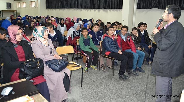 \r\n\r\n Radyo Programlarında işlediği medeniyet ve kültür konuları ile Kahramanmaraş'ın kültür ve medeniyetine köşe yazılarıyla sahip çıkan Mesut Bilal Buğday, Pazarcık İmam Hatip ortaokulu konferans salonunda okul öğrencilerine "TV ve İnternetin yararları ve zararları" konferansı verdi.\r\n\r\nKonferansının içeriğinde öğrencilere şunlara değindi;\r\n\r\nMedya organı; halkımızın haber almasını, bilinçlenmesini sağlayan önemli bir görev üsleniyor. Ancak medyanın olumsuz yanları topluma daha fazla yansımaktadır. Özellikle gençlerin dizi filmlerden kendilerine karakter oluşturmaları, kendi öz benliklerini kaybetmelerine sebep olmaktadır. Ben özellikle medyanın toplum üzerinde olumsuz etkilerini filmlerden kestiğim bölümlerle anlatıyorum. Örneğin Küçük Emrah filmde şöyle bir sahne var, Emrah zengin olmuş ve evine televizyon almış. Annesine ve kız kardeşine şöyle bir söz kullanıyor: “Artık insan gibi yaşayacağız” Yani Emrah diyor ki: “Fakirken hayvan gibi yaşıyorduk, zengin olunca insan gibi yaşayacağız.” Filmin bir ileri sahnesinde ise, Emrah vuruluyor ve annesi sokağa fırlıyor ve annesi feryat figan içerisinde oğlunu kucağına alıyor ve ölüm anında şahadet kelimesi çekmesini beklerken, bir anda söylediği söz şu: “Anne kız kardeşime topuklu kundura giydirme!”\r\n\r\nEmrah filmlerinde özellikle tüm yapılan kötü işler kaderin üstüne atılarak işin içinden sıyrılmaya çalışılmaktadır.\r\n\r\nHepimiz şu ayet mealini biliriz: “Size bir fasık haber getirdiğinde araştırmadan inanmayın” Ancak Yeşilçam filmlerinde şöyle bir sahne vardır. Eşler aşkla birbiri ile evlenmişler, ancak koca iş seyahati için yurt dışına gider. Ancak birisi bir tuzak kurar ve adamı telefonla arayarak “karın seni aldatıyor” der. Adam anında şüphe içinde kalır ve memleketine döner ve karısını başkası ile yakalar ve hiçbir şey sormadan sokağa atar. İş bu kadar kolaydır. Türk film ve dizilerinde hoca karakterleri çok kötü iken, meyhane sahibi ise; dertleri dinleyen babacan bir adam olarak gösteriliyor. Özellikle de mahallenin tüm yükünü karşılayan mahalle bakkalı namusa göz diken adam olarak işleniyor.\r\n\r\nDizilerde ise kimin eli kimin cebinde, kim kimin karısı, acayip hadiselerin şehvetle boyanarak sunuluyor. Oyuncunun saati, yüzüğü, hatta okuduğu kitap ön plana çıkarılarak o ürünün satışı sağlanıyor.\r\n\r\nÖzellikle televizyonlarda şu an evlenme programları en çok izlenen kuşak. Özellikle gençlerin bu programlardan uzak durması gerekir. Çünkü evlenme programında evlenen kişi reklam arasında geri boşanır. Çünkü ailenin mahremiyeti ortadan kalkıyor.” Dedi.\r\n\r\nKonferansı katılan ve beğeniyle izleyen gençlerden program sonu Mesut Bilal Buğday'a hediyeler takdim edildi. \r\n\r\nOkul Müdürü Sıttık Yumrutaş gerçekleştirilen programdan dolayı teşekkür ederek Mesut Bilal Buğday'a çiçek ve hediye takdim etti.\r\n\r\n \r\n\r\n \r\n\r\n \r\n
