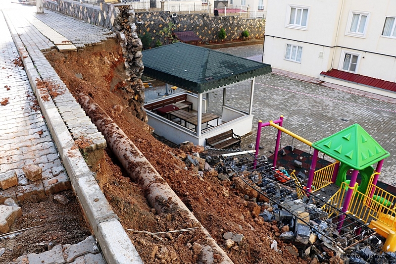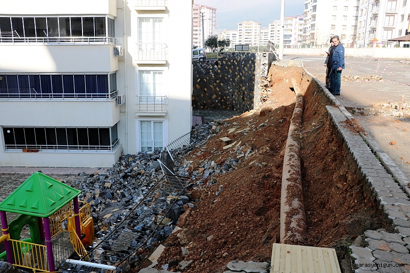 Olay, Onikişubat ilçesi Vadi Mahallesi’nde bir sitede meydana geldi. Sabah 07.50 saatlerinde büyük bir gürültüyle uyanan site sakinleri, istinat duvarlarının çöktüğünü gördü. Olay yerine gelen polis ekipleri çevre güvenliğini alırken, itfaiye ve ilgili kurumlar olası su ve gaz kaçağı olmaması için önlem aldı. Aşırı yağmur nedeniyle istinat duvarının çöktüğü öğrenilirken, çökme anı bir iş yerinin güvenlik kamerası tarafından saniye saniye görüntülendi.