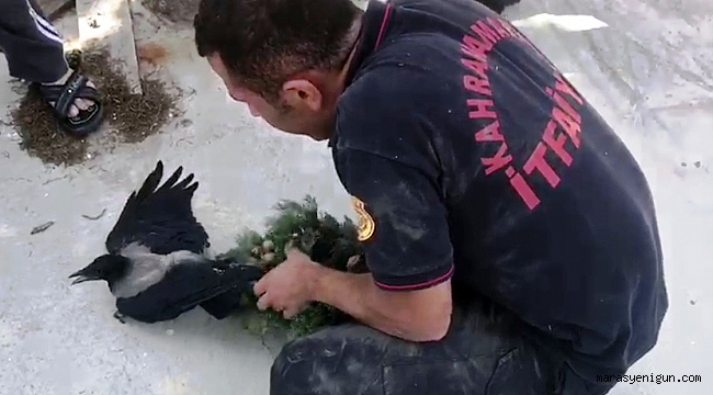 Dulkadiroğlu ilçesi, Namık Kemal Mahallesi'nde 30 metre yüksekliğindeki çam ağacında ipe dolanan kargayı fark eden vatandaşlar durumu itfaiye ekiplerine bildirdi. İhbar üzerine kısa sürede olay yerine gelen itfaiye ekipleri, ilk önce karganın dolandığı dalı kesti. Ağaç dalıyla birlikte aşağı indirilen karga, ipten kurtarıldıktan sonra serbest bırakıldı. Özgürlüğe kanat çırpan karga, kısa sürede gözden kayboldu.
