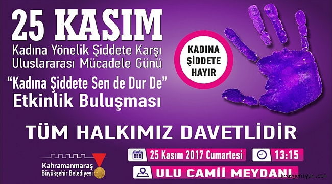 Kahramanmaraş Büyükşehir Belediyesi 25 Kasım Kadına Yönelik Şiddete Karşı Uluslararası Mücadele günü dolayısıyla bir etkinlik düzenliyor.‘Kadına Şiddete Sen De Dur De’ sloganıyla yapılacak etkinlik 25 Kasım 2017 Cumartesi günü saat 13.15’te Ulucamii Meydanı’nda yapılacak.Kahramanmaraş Büyükşehir Belediyesi Sağlık ve Sosyal Hizmetler Dairesi Başkanlığı Kadın ve Aile Şube Müdürlüğü tarafından organize edilecek etkinlikte kadınlara yapılan şiddete dikkat çekilerek şiddete dur denilecek.
