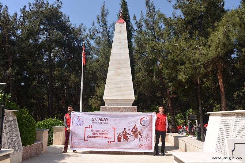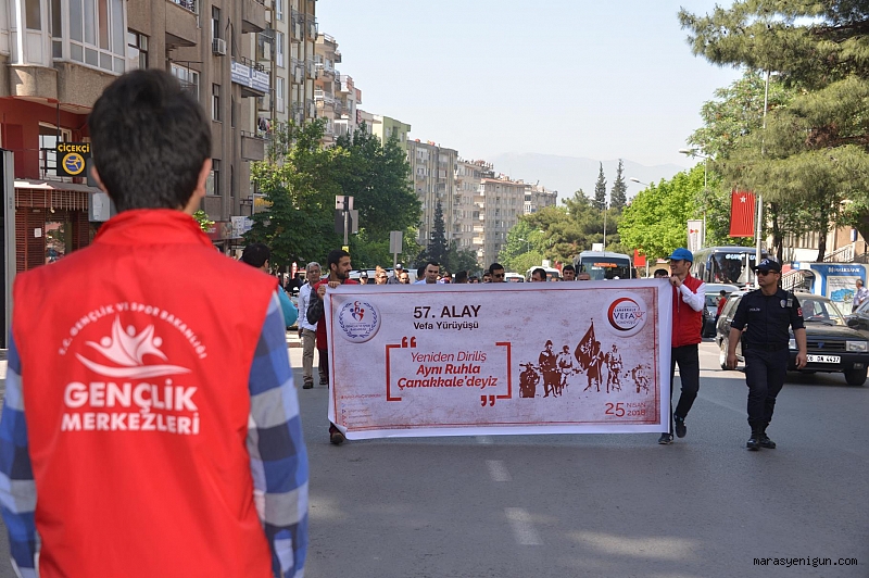 Gençlik ve Spor Bakanlığınca her yıl düzenlenen 57. Alay Vefa Yürüyüşü Çanakkale’de 57. Alayın büyük fedakârlık göstererek İngiliz ve Anzak Askerlerinden sayıca az olmalarına rağmen düşmanı püskürtüp Çanakkale Savaşının kaderini değiştiren bu alaya Vefa Yürüyüşü olarak 81 ilden Çanakkale’ye gelen gençlerle birlikte aynı Ecdatlarının 103 yıl önce yaptıkları gibi sabah namazı kılıp yarma çorbalarını içip bu kutlu yürüyüşü gerçekleştirdiler.Kahramanmaraş Gençlik Hizmetleri ve Spor İl Müdürlüğü Gençlik Merkezleri olarak İlimizde ki Gençlerle birlikte ecdadımızı anmak adına “Yeniden Diriliş, Aynı Ruhla Çanakkale’deyiz.” sloganı ile 25 Nisan 2018 günü Kahramanmaraş Gençlik Merkezi önünden başlayarak Şehir Merkezinden geçip Kahramanmaraş Şehitliğine kadar olan güzergâhta 100 Metrelik Türk Bayrağımız ve yaklaşık 300 gençlik merkezi üyelerimiz, Antrenörlerimiz, Sporcularımız ve İl Müdürlüğü personellerimiz ile Çanakkale 57. Alay Vefa Yürüyüşünü Allahu Ekber nidaları ile gerçekleştirdik. Şehir merkezinde yürüyüş kortejine vatandaşlar alkışlar ve sloganlarla destek oldular.Şehitlik Kapısında okunan İstiklal Marşımızın akabinde Şehitliğimizde Kahramanmaraş Gençlik Hizmetleri ve Spor İl Müdürü Ali İhsan Kabakcı Günün anlam ve önemine Binaen yaptığı açıklamada; ‘Üzerinde yaşadığımız topraklar kolay kazanılmamış her bir karışı için kahraman ecdadımız kanıyla canıyla bedel ödemiştir ve günümüzde de yine bu vatanda yaşamanın bedelini 15 Temmuz gecesi hainlere karşı Aziz Milletimiz canları ile ödemişlerdir. Bizlerde bu gün gençlerimize Çanakkale’yi, Sarıkamış’ı, Kut’ül Amare’yi, Sakarya’yı, Dumlupınar’ı ve bir çok ecdadımızın kazanmış olduğu zaferleri ve 15 Temmuz’u unutturmamak adına bu tür programlar gerçekleştiriyoruz. Amacımız Maneviyatı yüksek, Spor Kültürü ile yoğrulmuş Geleceğin Güçlü Türkiye’si için Diriliş Neslini yetiştirmektir. Programa iştirak eden tüm katılımcılara teşekkürlerimi iletirim’ dedi. sonra Gençlik Merkezi Üyesi Hafız Bekir Büyükkurt Okuduğu Kur’an-ı Kerim tilavetinin ardından Tüm Şehitlerimiz Ruhuna Fatiha-ı Şerife Okundu. Program sonunda tüm katılımcılara Kahramanmaraş Büyükşehir Belediye Başkanlığı tarafından Çorba ikramı yapıldı.
