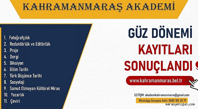 Büyükşehir Belediyesi tarafından düzenlenen Kahramanmaraş Akademi’de güz dönemi başvuru sonuçları açıklandı. 11 atölyeye toplamda 2 bin 238 kişi başvuru gerçekleştirdi. Atölyeler, 24 Ekim Pazartesi günü başlıyor.