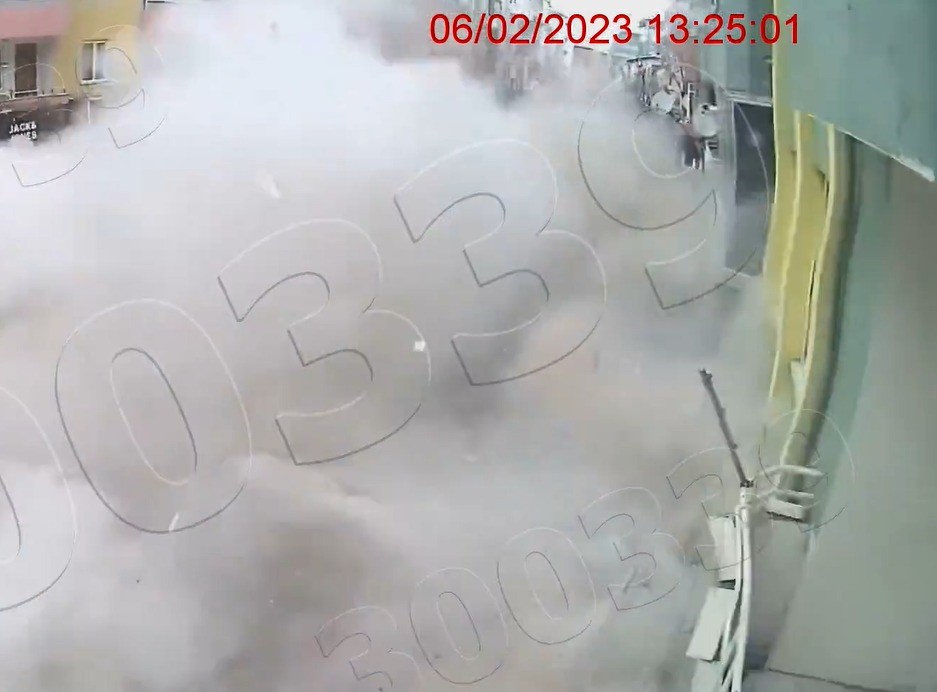 Görüntülere, bazı binaların büyük bir gürültüyle çöktüğü, çöken yapıların çevresinde yoğun toz bulutunun oluştuğu ve yollara beton parçalarının savrulduğu yansıdı. Depremin etkisiyle çevrede bulunan iş yerlerinin camlarının kırıldığı, tabelaların sallandığı ve çevrede kısa sürede büyük bir kargaşa yaşandığı da kaydedildi.