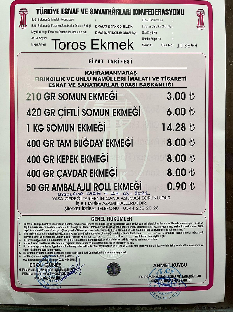 Kahramanmaraş’ta alınan karar doğrultusunda Pazar gününden itibaren geçerli olmak üzere 210 gram somun ekmeği 3 liradan satılacak.